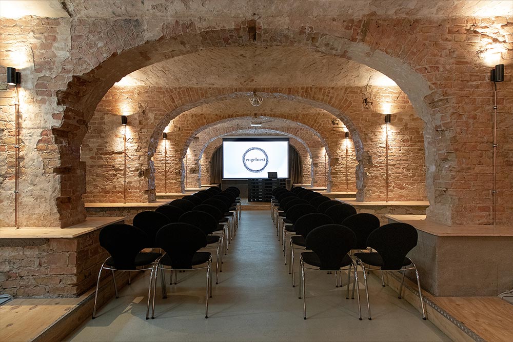 Choose between our bright Palettenlager hall, the atmospheric Einkeller underground space, or our cozy lounge and veranda area — each designed to inspire creativity and connection. All venues can be customized with flexible furniture setups, high-end sound and lighting systems, projectors, and presentation equipment.
